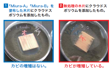 | 試験内容 | Miura-A とMiura-B を塗布した木片と、無処理の木片にクロカビ( クラウドスポリウム)を添加して、カビの増殖を検査。 |