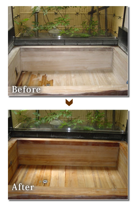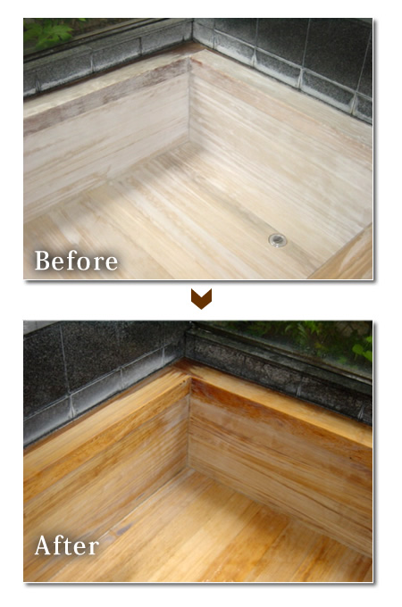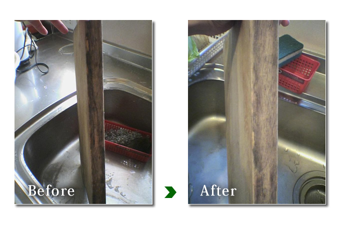 SOKEN飾屋の洗浄剤(創研株式会社製造)をお使いになる前は、塩素を使っておそうじをされていました。塩素は木を漂白するので、一見きれいになったように見えますが、木の繊維を傷めますし、ぬめり等の解決にはなりません。何より人体に有害ですのでオススメできません。SOKEN飾屋の洗浄剤で洗ったところ、黒ずみ・ヌメリが取れて木本来の美しさが蘇りました。使い続ければ、繊維の奥に入り込んだカビも除去できます。